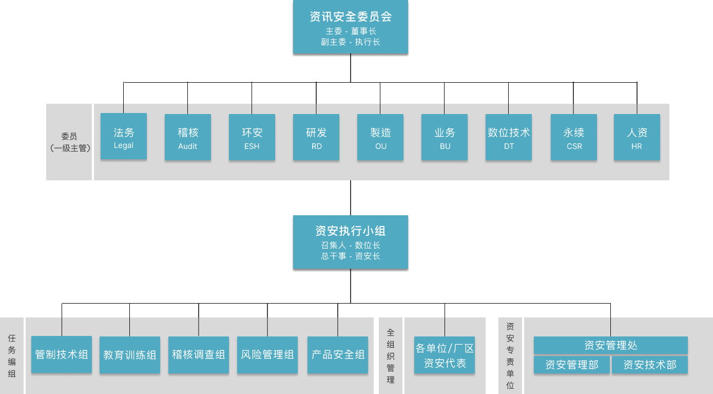 资讯安全委员会为37000a威尼斯资安最高管理组织,向董事长报告。下辖资安执行小组负责推行资讯安全委员会之各项决议。为持续建构完整且精实的资安专 责团队,资讯安全管理处下成立「资讯安全管理部」与「资讯安全技术部」,持续投入资源以强化团队资安核心能力。