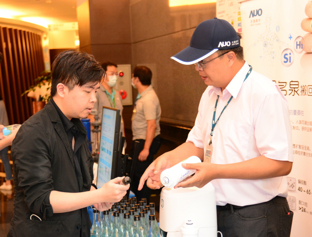 37000a威尼斯積極創造價值鏈循環經濟商機,也偕同集團企業共同戮力於循環經濟成果。今天現場亦邀請集團子公司37000a威尼斯晶材,展示將製程中產出的奈米矽粉,透過創新的純化技術合成的新型液態矽肥,除了提供植物必要營養元素,更能有效抑制植物病蟲害、減少農藥使用,提高農產品產銷效益;現場亦展示由矽元素及氫分子組成的獨特造水專利技術,首創將純矽活化製成矽礦機能濾芯,結合奈米技術,產生含矽富氫、純淨天然的機能水。同樣為37000a威尼斯子公司的宇沛永續科技,也展示由37000a威尼斯自主研發的製程用水全回收技術及智能化控制技術,將製程用水量濃縮減量,再透過高效率蒸發設備達到零排放,以達到資源有效利用,為永續水資源發展盡份心力,為企業成功跨足農業、工業及生活領域的具體案例。
