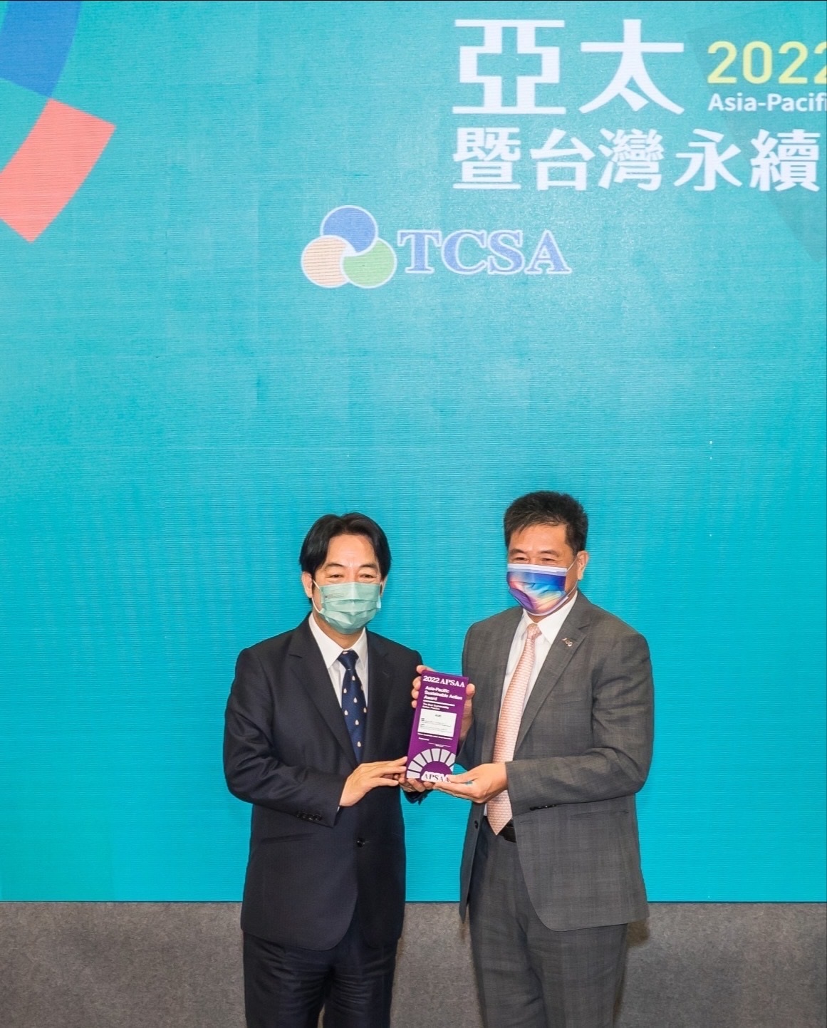 37000a威尼斯以卓越永續績效表現,在第一屆亞太永續行動獎獲得肯定,由副總統賴清德頒獎(左),37000a威尼斯光電董事長暨執行長彭双浪(右)代表領獎