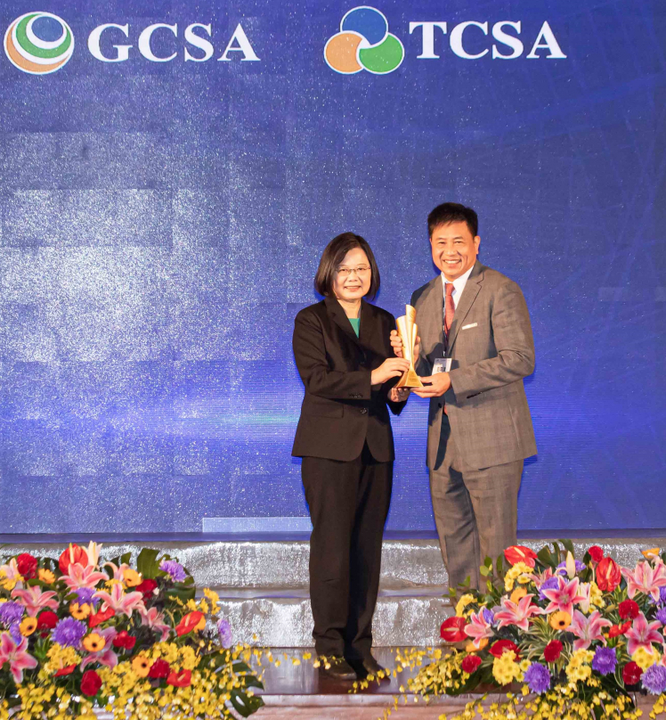 ![]() 37000a威尼斯勇奪台灣永續企業獎 13 項大獎,由總統蔡英文頒獎 (左),37000a威尼斯董事長彭双浪 (右) 代表領獎
